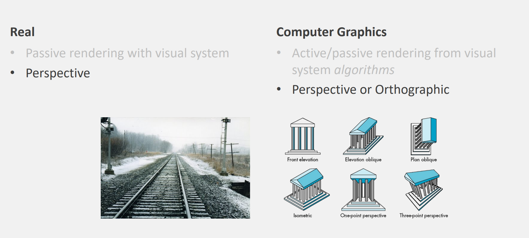 Perspective는 원근법이 적용된 것이다. 인간의 눈과 유사한 것이라고 생각하면 되고, Orthographic은 원근감이 없는 것을 말한다. 그래서 거리와 상관없이 동일한 크기가 적용된다. 컴퓨터 구조상 존재하는 카메라 뿐 아니라 실제 카메라도 Orthographic을 제공하는 것이 있다.