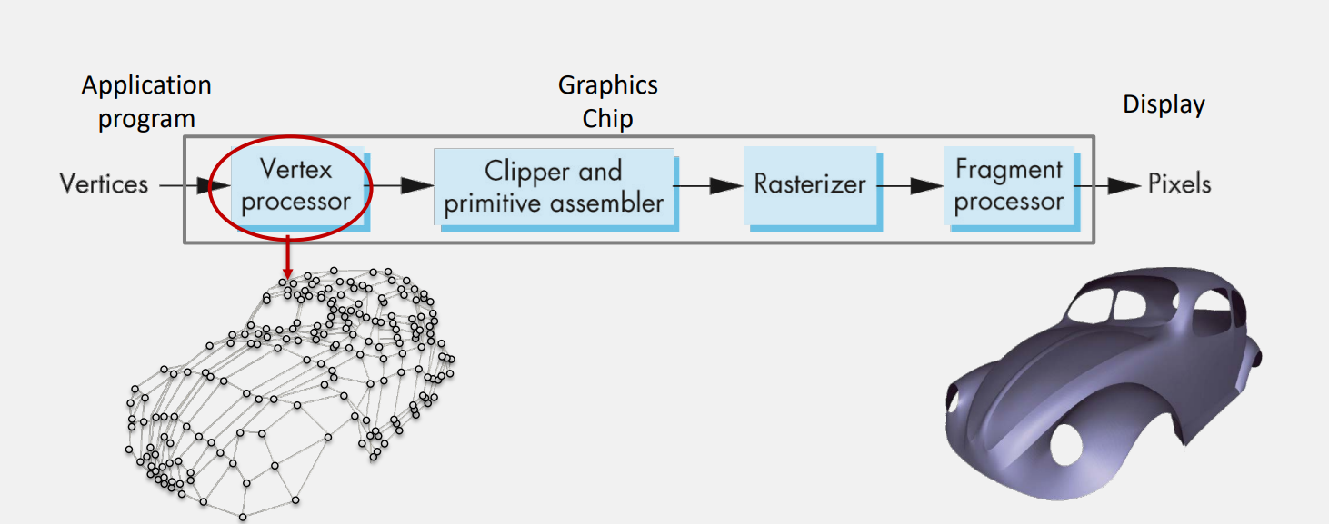 Vertex processor는 물체의 Vertices를 하나의 좌표계로 변환해준다. 이게 무슨 소리냐면 물체 그 자체의 정보는 고정되어 있지만 게임을 보면 물체는 계속 움직일 수도 있다. 그래서 미리 정해둔 특정 좌표계로 변환을 해서 물체가 원하는 위치에 갈 수 있도록 해 주는 것이다. 나중에 더 자세히 알아보겠다.