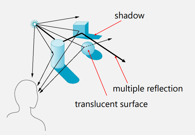 Global illumination에서는 Ray tracing등을 적극 활용하여 최대한 현실세계와 유사한 Lighting을 만들어낸다. 현실세계에서의 빛은 물체에 반사되기도 하고, 흡수되기도 한다. 또한 어떤 물체에 반사된 빛이 다른 물체에 들어오기도 하는 등 연쇄 반응을 엄청나게 많이 일으킨다. 이 때문에 대낮에 불을 다 끄고 있더라도 미세한 광원이 들어오고 있다면 방 전체의 물체가 식별 불가능할 정도로 어둡지는 않은 것이다.