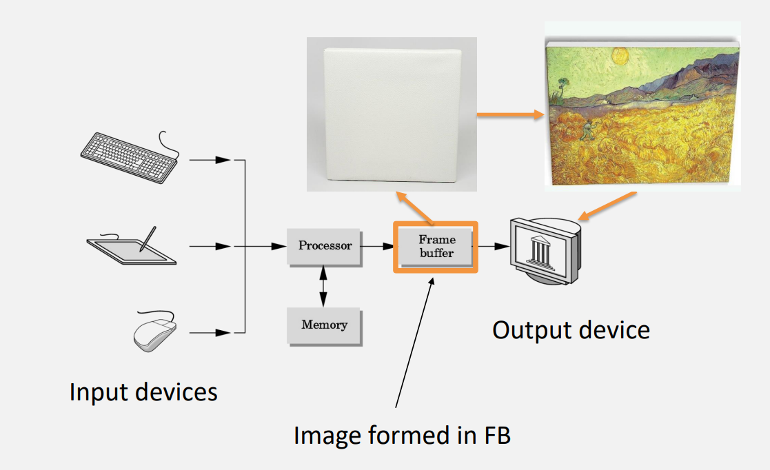 특정 데이터(이미지, 동영상, 3D model 등등)을 모니터에 그리기 위해서는 Buffer를 사용하게 된다. Frame Buffer는 비디오 디스플레이를 구동하는 비트맵이 담겨있는 RAM의 한 부분이다. 우리가 주로 사용하는 1920 x 1080 모니터는 1920 x 1080 픽셀을 가지고 있다. Frame buffer는 이 모든 픽셀의 색상값을 저장하는 버퍼이다. 버퍼가 전부 채워지면 화면에 그리는 방식으로 구성되어 있다. 사실 대부분은 Double Buffering을 사용한다. Frame Buffer가 2개 있다는 얘긴데 이건 다음에 설명하겠다.