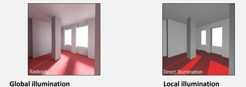 3D 그래픽을 크게 2개로 구분하자면 Global illumination과 local illumination으로 나눌 수 있다.